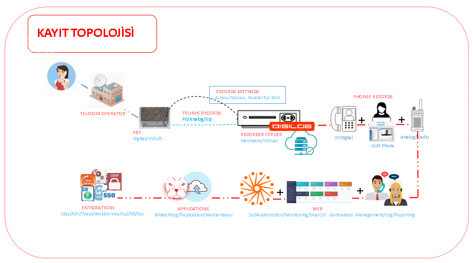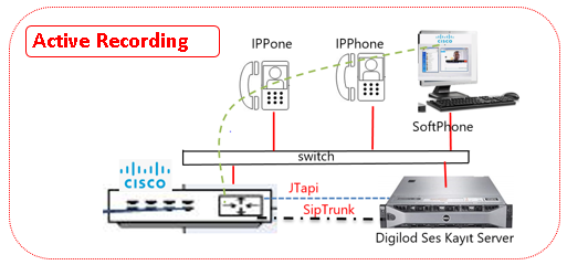 Ses kayıtların alınması için Cisco ile Digilog arasında Sip Trunk oluşturulur ve yapılan konuşmaların bir kopyası bu trunk üzerinden kayıt serverine gönderilerek ses kayıtlarının alınmasının sağlanır.
