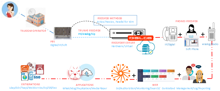 Digilog; Tdm (Analog, Pri-Pcm, Digital) / IP-Sip / Telsiz kaynaklarından gelen sesleri kayıt eden, dinleten ve geliştirilmiş uygulamalar ile güvenli, şeklide çalışmasının desteklendiği %100 Aktif Telecom Ses Kayıt çözümüdür.
