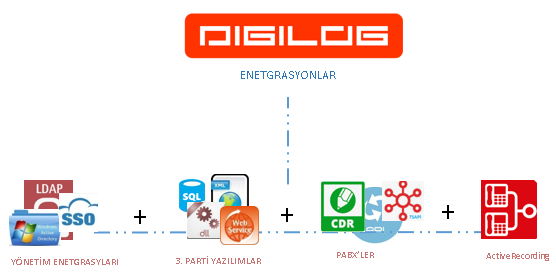 Digilog, yönetimsel entegrasyonları, 3 parti yazılımlar ile entegrasyonları ve Pabx’ler ile entegrasyonu sağlayacak entegrasyon seçeneklerine sahiptir.